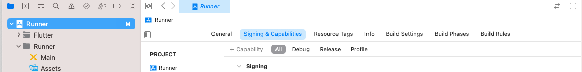 - TARGET의 Runner > 2번째 탭 Signing ~ 클릭